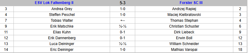 Unsere 3. Mannschaft hatte den weiten Weg nach Falkenberg. Es wurde gut gekämpft und dennoch verloren. Gerade die Niederlagen an den ersten zwei Brettern waren sehr schmerzlich. Klasse die Siege von Dirk und Erwin.