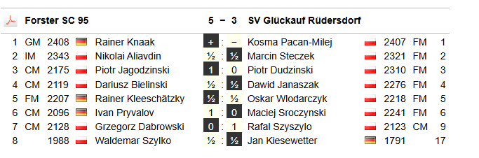 Es war sehr spannend und Glück und Pech hielten sich die Waage. Rainer und Pjotr konnten sich aus schlechteren Stellungen mit Hilfe der Gegner befreien. Dafür hat Nikolai ein gewonnenes Endspiel versaut. Noch schlimmer Gregorz am Brett 6. In klar besserer Stellung gepatzt und verloren. Die letzte Partie beim Stand von 4:3 gewann dann Piotr am Brett 3 noch souverän. 5:3 gewonnen – vor 3 Jahren noch 0,5:7,5 verloren.